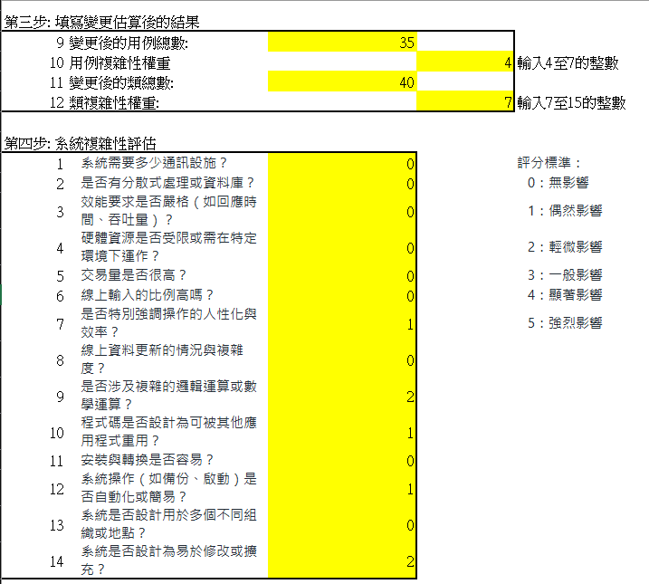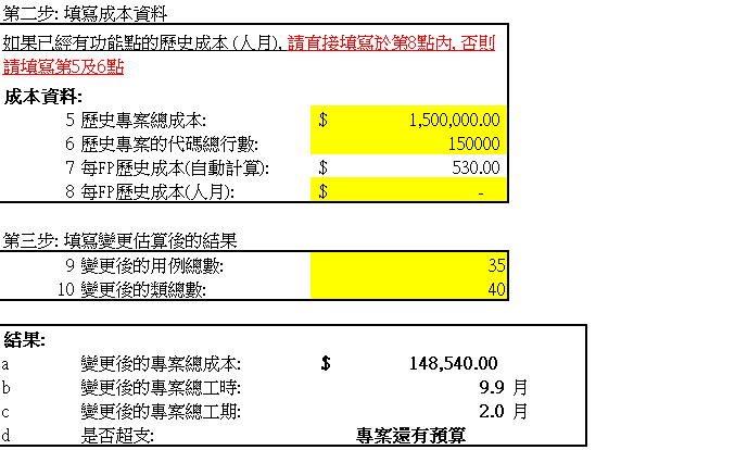 只需輸入「變更後的用例總數」 及 「變更後的類(Classes)的總數」 ,即能計算出變更後專案所需的總成本及所需工期,幫助專案經理在應對變更時,有更多的資料來作出決策。